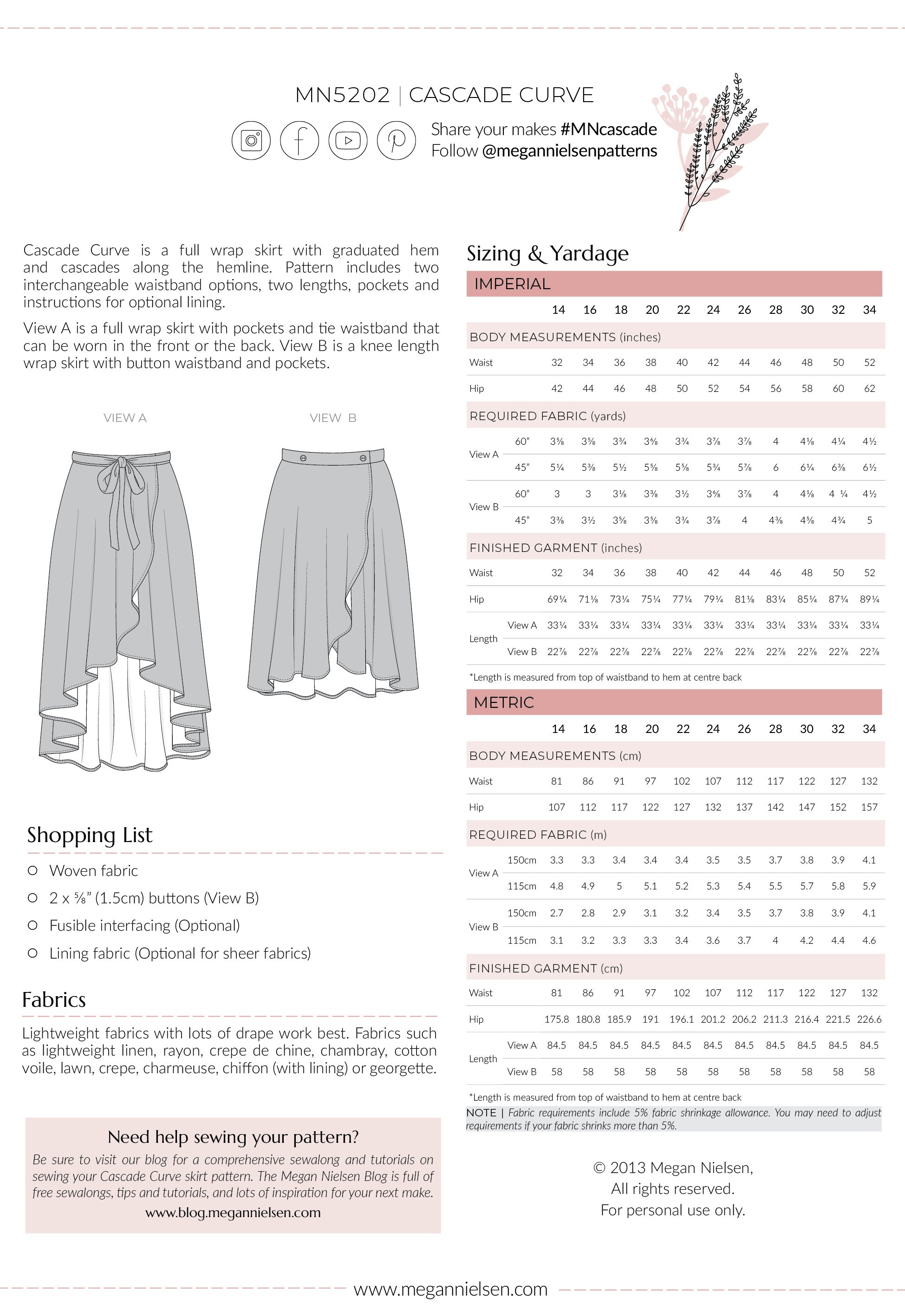 Cascade is a full wrap skirt with graduated hem and cascades along the hemline. Pattern includes two interchangeable waistband options, two lengths, pockets and instructions for optional lining.