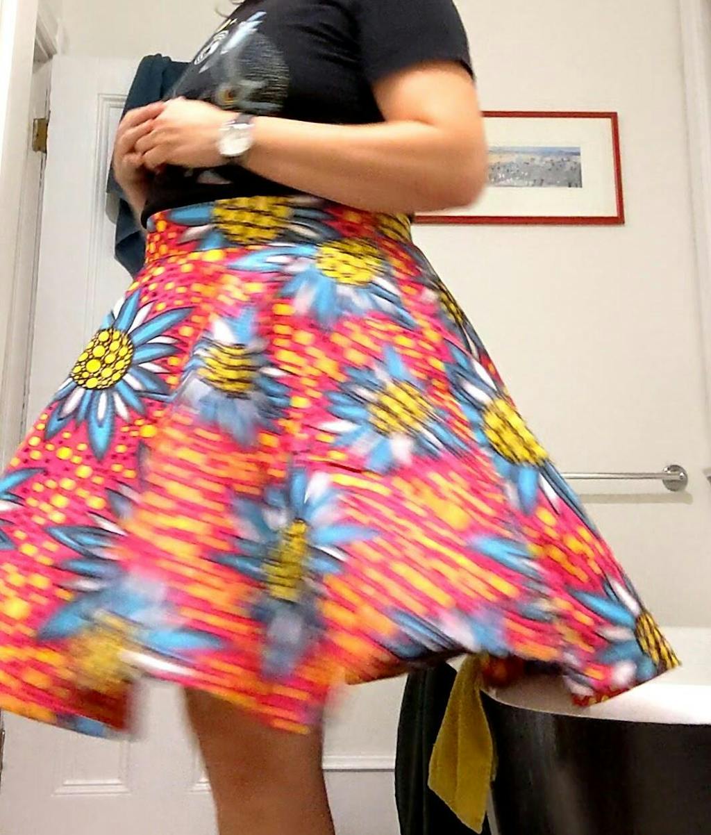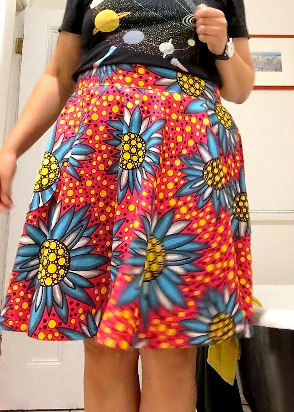 Basic full circle skirt for woven or stretch fabrics. Pattern features optional roomy scalloped pockets and two waistband choices.
